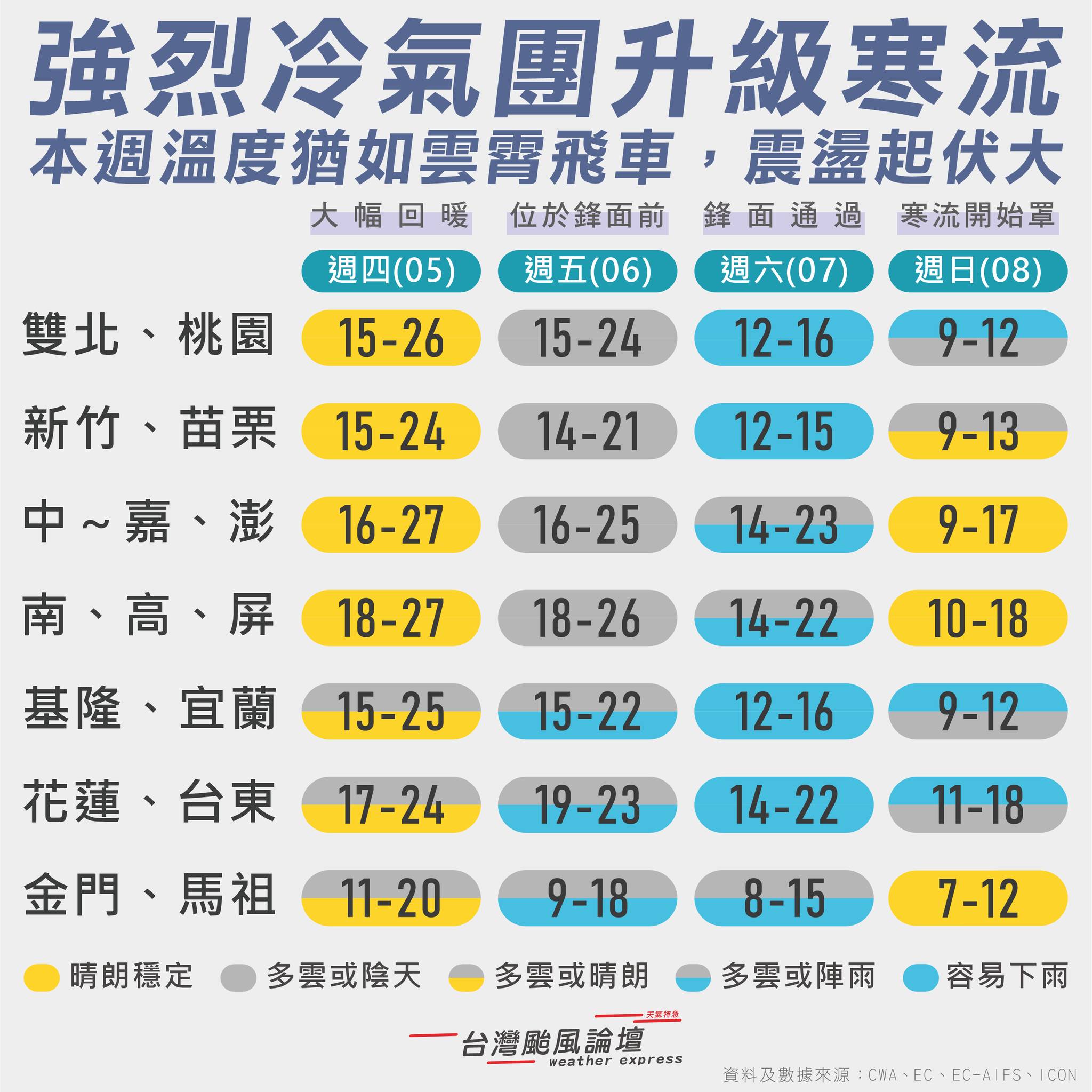 「台灣颱風論壇|天氣特急」表示,周六鋒面快速通過,凌晨至中午期間各地有下雨機會。下午隨著鋒面逐漸遠離,西部地區短暫雨後多雲,宜花東仍有陣雨。寒流開始南下,各地氣溫快速下降,愈晚愈寒冷。周日寒流籠罩,全台寒冷,水氣殘留,北部、東部仍有零星小雨機會;中部、南部放晴。