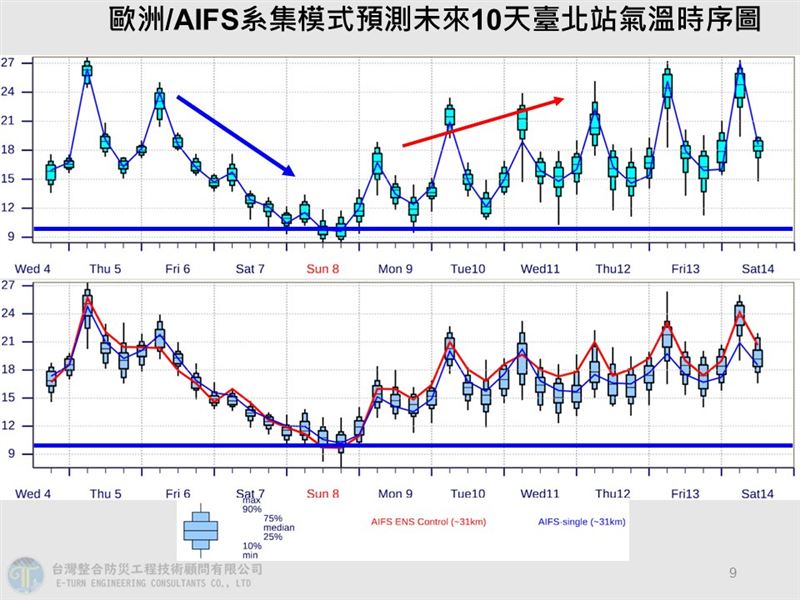 賈新興預估,本波最低溫出現在週日晚上至下週一(8、9日)清晨,臺北站最低溫約9.8至10.3度,西半部空曠區有出現5至7度低溫的機率,花東縱谷則有出現7至9度低溫的機率。預估北部及宜蘭,2000公尺以上高山,於週六深夜至週日清晨有降雪的機率,合歡山則有出現冰霰的機率。