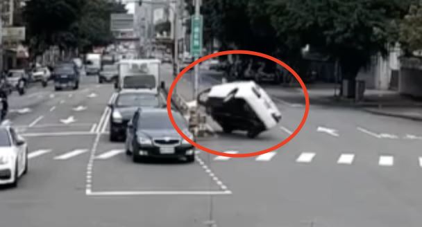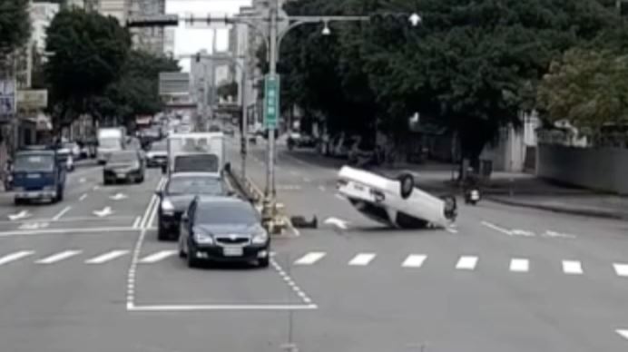台中市東區驚傳翻車事故!今(6)日下午3時許,有輛白色轎車行經進化路,通過精武路口時因不明原因自撞左側的中央分隔島,轎車瞬間彈飛翻覆,四輪朝天仰躺在道路中。警消人員獲報趕抵,發現駕駛已自行脫困,所幸僅受輕傷無大礙。