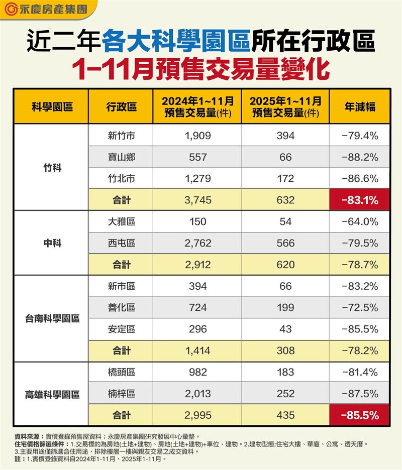 根據永慶房屋統計,比較2024、2025四大科技園區預售屋交易市況,依衰退情況排序,高雄園區年減85.5%、竹科園區年減83.1%、中科及台南園區年減超過75%;進一步觀察,園區有四行政區衰退最嚴重,通通超過8成,包括高雄楠梓、高雄橋頭、新竹寶山、新竹竹北。