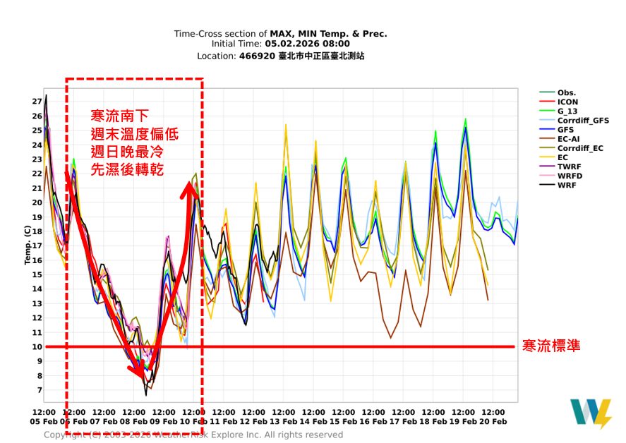 明晚到周日上半天,深厚冷空氣南下,吳聖宇表示,根據預報資料,包括850hpa(1500公尺)或是700hpa(3000公尺)的0度等溫線,都有南下到達台灣中北部上空的預測。周日一整天都涵蓋在台灣中北部,要等到下周一清晨才會離開台灣上空,向北退回。底層為強勢偏北風,中層也是較強的偏北到西北風,冷平流預期會相當明顯。中層水氣較多的情況會維持到周日清晨,周日上午後明顯轉乾。