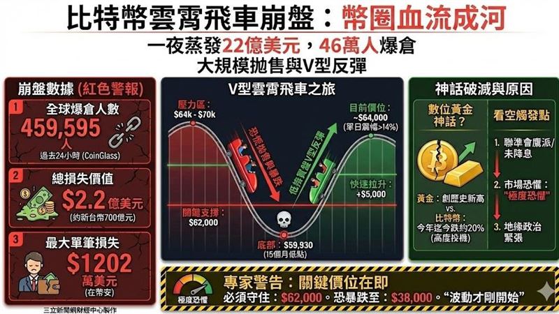 幣圈經歷了驚心動魄的「黑色星期五」!在市場恐慌情緒全面引爆下,比特幣(Bitcoin)價格今(6)日清晨一度失守6萬美元大關,創下15個月來新低。根據統計,過去24小時全球近46萬人慘遭爆倉,總金額蒸發超過22億美元(約新台幣700億元)。然而,就在市場一片絕望之際,低接買盤湧入,比特幣隨即上演「大怒神」式V型反轉,短線狂拉近5000美元,讓投資人看傻了眼。