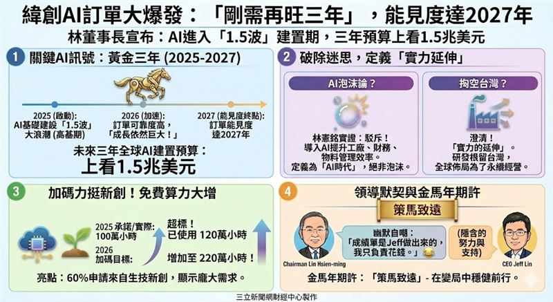 回顧2025年表現,林憲銘形容是AI基礎建設的「1.5波」大浪潮。他指出,雖然初期建設看似到頂,但根據市場分析,未來三年全球AI建置預算將上看1兆甚至1.5兆美元。