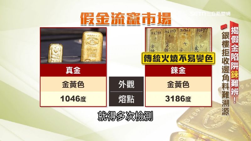 「金包銀」的假金火一燒當場現形,但更棘手的是混入錸金的假金,熔點約三千度,高溫下不易變色,X光只驗單點就得多次檢測,不僅耗時又高風險。