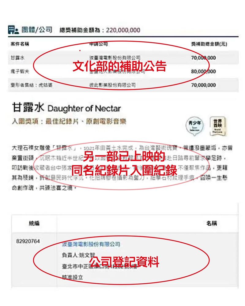 提及網軍一條龍的抹黑,姚文智還原過程,先是從「刻意」將不同出處網路公告移花接木,把兩部都叫做《甘露水》的紀錄片(已入圍金馬)和電影(尚未拍)混淆(如圖),放把火引發議論,然後烙跑,再由國民黨接手,抽離所有事件的背景脈絡,以「姚文智拿70,00萬補助」大作文章,竟還發國民黨的正式臉文。然後,藍白垃圾人物接手,「退休爽領民進黨補助7000萬」、「有黨證就有錢」、「政治退休安家費」,用這些內容唐塞親中舔中恣意妄為的行徑。
