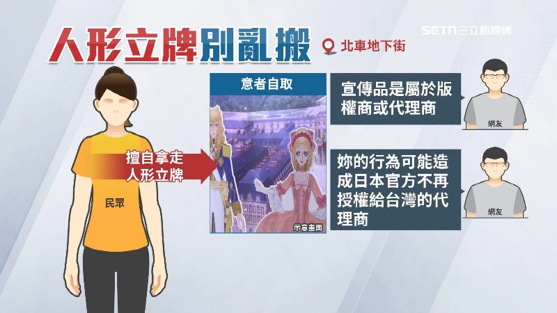 不論追星還是追番,不少粉絲如果有機會都會想要收集人形立牌,近日就有民眾發文分享自己在北車地下街看到店家不需要的人形立牌,上頭還寫著「意者自取」,讓他們想都沒想直接搬走,原本只是打算分享喜悅,但貼文一出不少網友紛紛留言宣傳品立牌不能拿走,不僅觸犯版權,嚴重還可能造成日本官方不再授權。