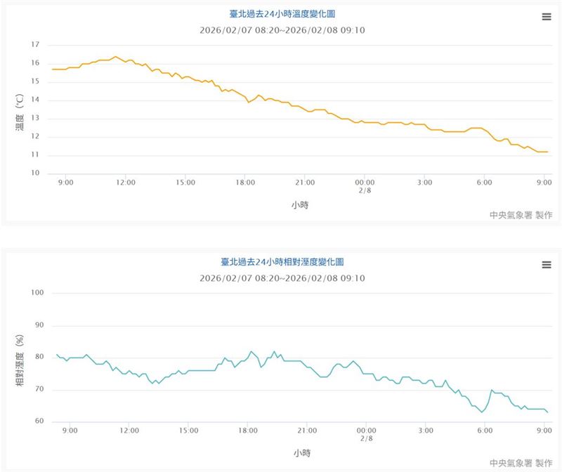 好冷!你今天有被冷醒嗎?氣象專家吳聖宇今(8)天上午貼圖指出,從台北站過去24小時的溫度、相對濕度變化可以看出,溫度呈現一路緩降的趨勢,相對濕度也同時在往下降。