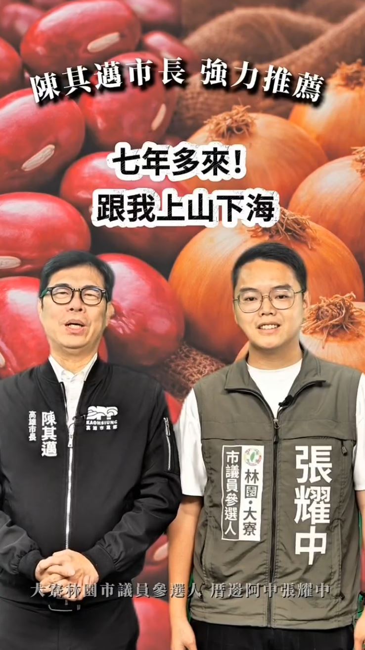 陳其邁在影片中指出,張耀中過去七年都在市府團隊服務,擔任隨行秘書期間跟著他上山下海,接受過完整的行政磨練,對於市政運作與第一線選民服務都相當嫻熟。陳其邁說,張耀中是一位認真、肯做事的年輕戰將,而大寮與林園需要這樣有體力、有衝勁的新人來為地方打拚。