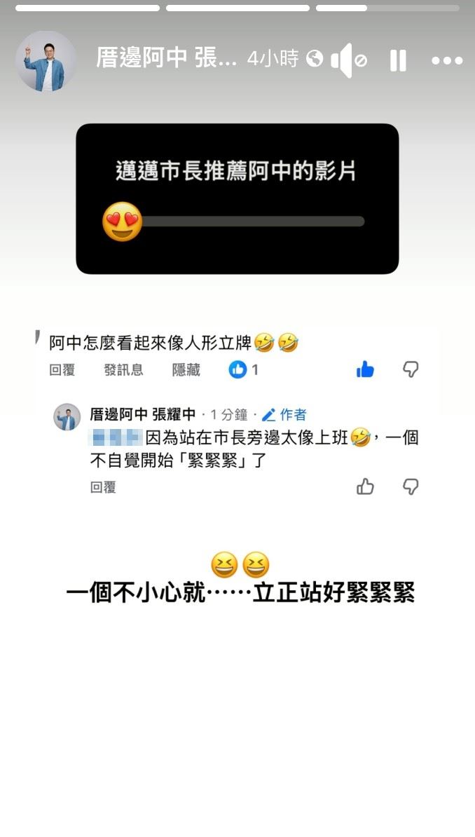 對此,張耀中親自在限動中解答:「因為站在市長旁邊太像上班,一個不自覺就開始『緊緊緊』了」。張耀中表示,市長的推薦不只是支持,更是一份責任的託付,七年來在市長身邊學習,深刻體會到市政必須落實、服務必須到位,他已準備好把這份經驗帶回大寮、林園,在議會為地方發現聲、為鄉親爭取建設。
