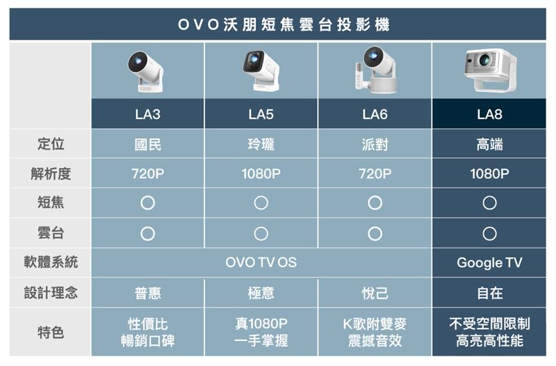 邁入 2026 年,投影機市場迎來規格大洗牌。不用額外購買腳架的「雲台」款,以及投影畫面更大的「短焦」機型,成今年選購投影機新寵。OVO 旗下沃朋(Warpple),在短短 8 個月內發表了 4 款定位不同的短焦雲台投影機新品,同時宣布今年 1 月雲台款銷量佔比首度突破 50%!最新推出的首款高階雲台投影機 LA8 ,整合短焦技術、200° 雲台與 Google TV 系統。相較前代畫面變大 53%、亮度增強 71%、體積減少 29%,是追求高端性能用戶的首選。