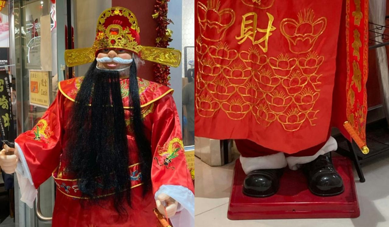 有網友在threads分享照片,顯示有餐廳趁農曆新年將至,便在門外擺放財神爺,寓意「招財」。照片中可見財神爺身型肥胖,他穿上財神爺服裝,留有長長的黑鬚,並戴上財神帽,但仔細留意會發現不少「穿幫」:外貌激似外國人,臉上亦出現濃密的白色大鬍鬚,再往下看竟然看見紅色絨質長褲,以及黑色疑似高筒靴,所謂「財神爺」根本是聖誕老人假扮。原PO深表同情,留言指「又要一人分飾兩角」。