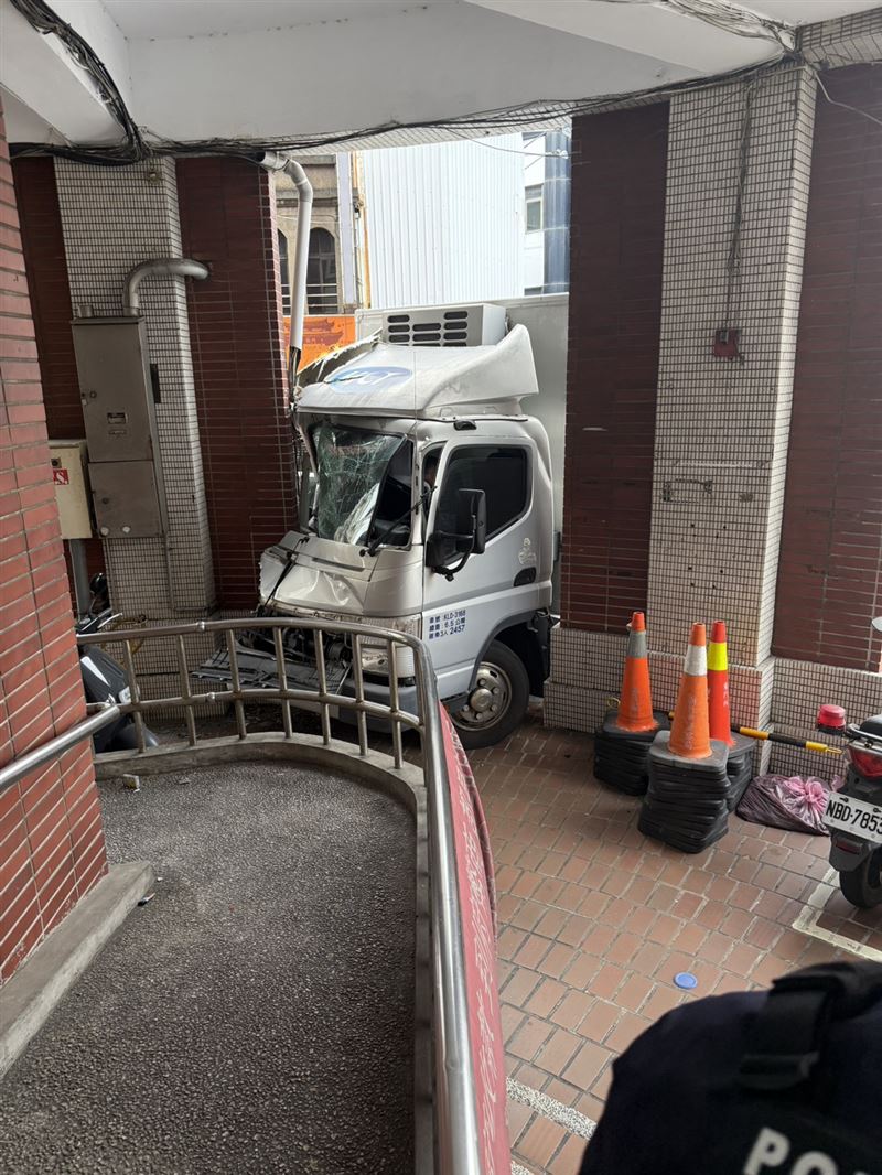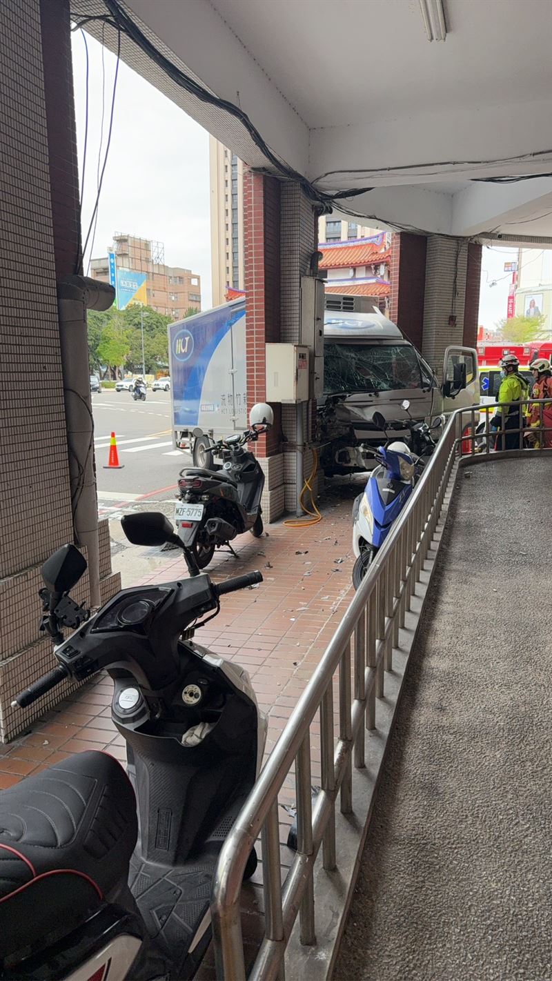 新竹市警第二分局東門派出所,今(9日)上午10時許,忽然驚天一響,一輛貨車不明原因撞進派出所騎樓,副駕駛座整個撞扁,擋風玻璃全部碎裂,50歲的史姓駕駛身上多處割傷,被緊急送往南門醫院救治。