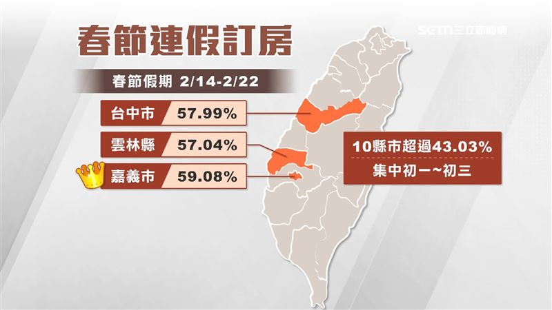 而根據觀光署統計,截至1月30日國旅訂房情形。包含嘉義市、台中市、雲林縣訂房率近6成,是訂房前三名,全台有10縣市訂房率,超過百分之43.03集中在初一到初三。