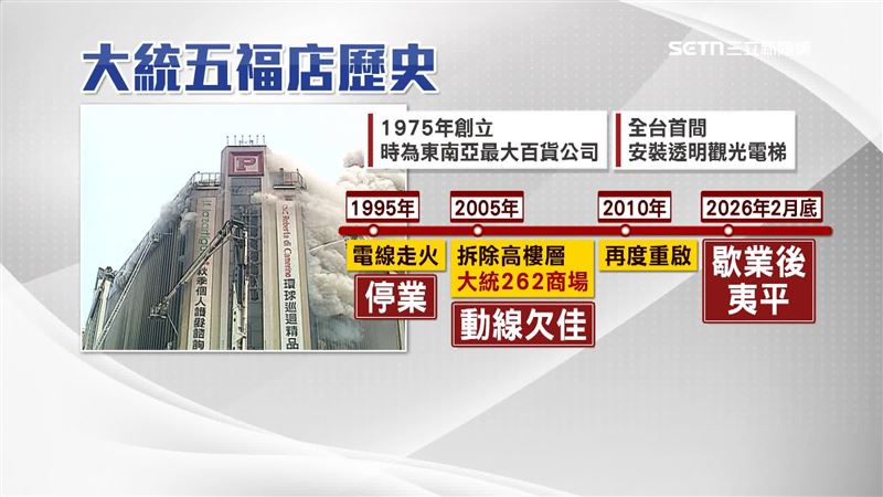 火災重創商機一度停擺,回顧歷史,1975年創立時是東南亞最大百貨公司,也是全台第一間有透明觀光電梯的百貨,1995年電線走火後停業,2005年改成「大統262商場」,因動線欠佳停業,2010年再度重啟,直到2026年2月底租約到歇業後夷平。