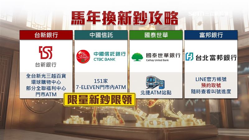 朝九晚五上班族沒時間跑銀行的看過來。民營銀行像台新、中信和國泰世華祭出百貨、超商或捷運站點,提供ATM提領新鈔,方便民眾辦年貨,逛街時順便換鈔。