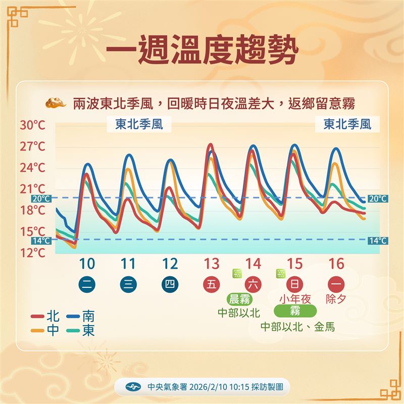 吳聖宇說明,下週一除夕到大年初一、初二將連續有兩波東北季風增強南下影響,間隔很短,基本上算是連在一起的影響,不過預報看起來冷空氣不強,大致為東北季風等級,屆時迎風面的北部、東半部降雨機會提高,溫度也下降轉涼,中南部不受影響,仍維持溫暖且較為穩定的天氣型態,日夜溫差變化較大。