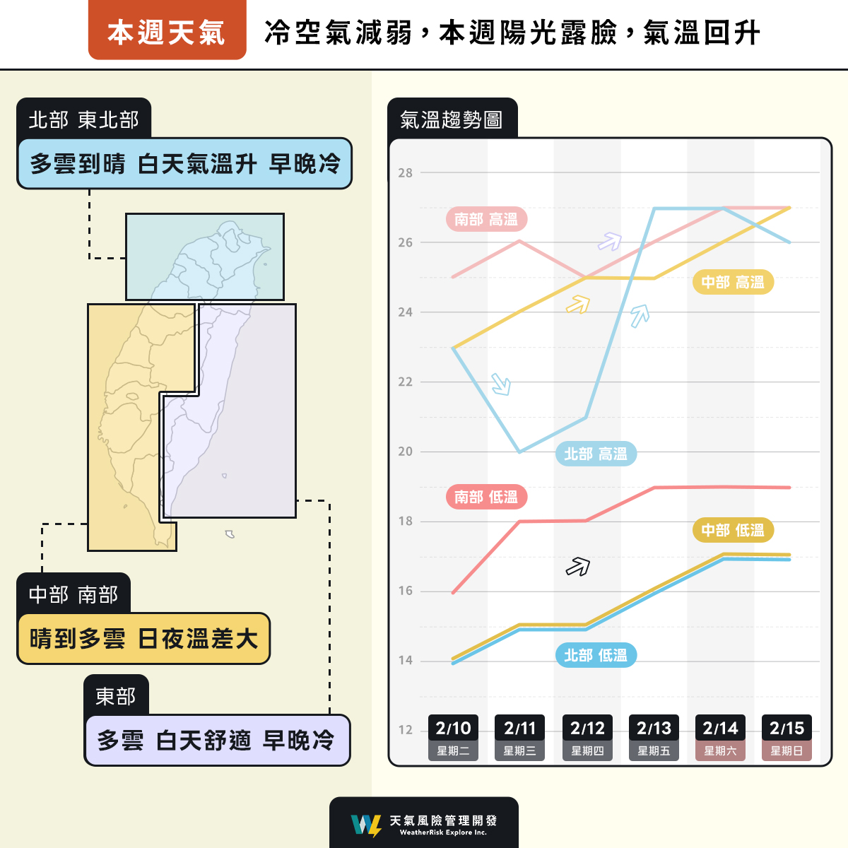 周四冷空氣減弱,各地氣溫再稍回升,白天20度以上。天氣風險公司表示,預估到周日各地維持晴時多雲,白天高溫可至25度以上,中南部局部接近30度,各地皆有受輻射冷卻影響,日夜溫差大,西部局部低溫約12至14度,北部低溫約13至16度。
