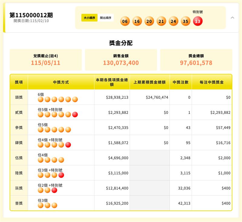 一般號碼:06、16、20、21、24、35特別號碼:13最佳安慰獎(貳獎):1注中獎,獨得 2,293,882 元