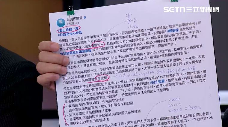 民眾黨提到空白授權說,張益贍打臉,這不知道講了多少天了,現在叫做條例,沒有空白授權的問題。條例過,每個軍購預算,還要送立法院再審一次,哪有所謂的空白授權問題?