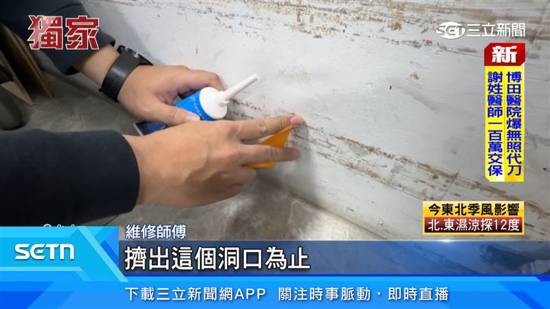 維修師傅:「把這擠進去之後呢,我們等它稍微軟的時候,再把它覆蓋掉盡量擠到,擠出這個洞口為止 。」