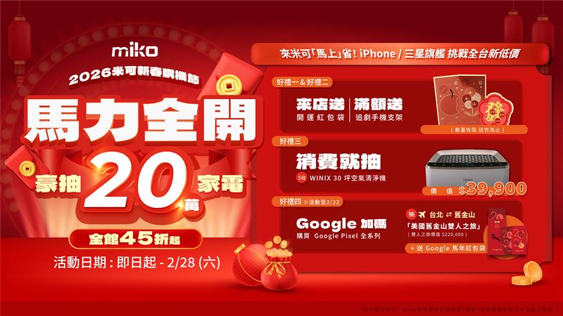 農曆春節進入最後倒數一週!隨著年終獎金陸續入帳,全台迎來年前最強換機潮 。知名連鎖通訊品牌「miko 米可手機館」宣布即日起至 2 月 28 日推出「新春購機節:馬力全開」活動。祭出「最低 45 折」的新年手機降價優惠,並提供總價 20 萬的大獎抽獎 。