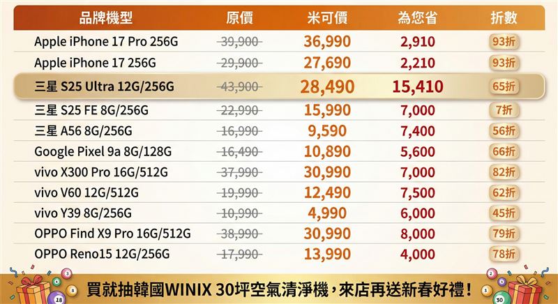 還能搭配「新春購機節:馬力全開」活動,活動期間「全館消費不限金額」即送「開運紅包袋」,還能抽價值近 4 萬元的「WINIX 30 坪空氣清淨機」(市價 $39,900,共 5 台),以及申辦門號或配件購物滿 $1,000 元就送「馬上發手機支架」。活動好評延長至 2 月 28 日。
