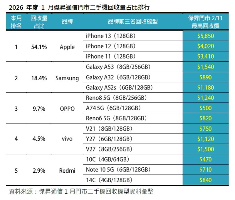 反觀安卓陣營,1月份各品牌回收占比同步下降,尤以三星本月回收量下跌14%最多。儘管Galaxy Z TriFold創造增值神話,但支撐三星回收總量的依然是Galaxy A53、A32與A52s等A系列中階機型;傑昇通信說,安卓品牌主力機型的回收金額普遍維持在千元左右的低水位,反映安卓中階機硬體價值快速貶值的通病,對消費者而言,安卓機若非高階摺疊或話題機型,提早回收、避免價格隨時間快速折舊,仍是相對務實的做法。