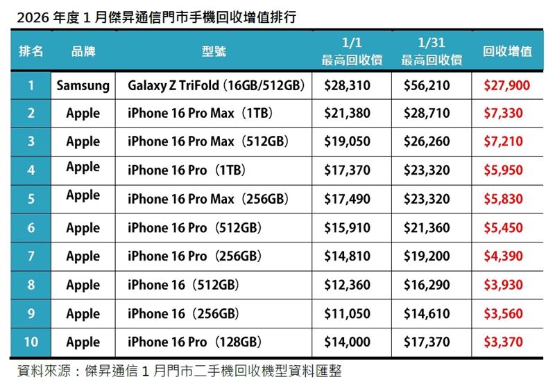 此外,2026 年 1 月台灣二手機回收市場明顯降溫,呈現量縮價漲的鮮明對比,整體回收量較前月下滑約25%,市場進入價值重估行情。傑昇通信彙整門市資料發現,在回收價格端仍有亮點支撐,前十名增值機型的單月回收金額全數破萬元,以三星Galaxy Z TriFold(16GB/512GB)單月回收價暴漲將近2.8萬元最為吸睛,成為回收增值王;若有年前資金需求,仍可在高階旗艦與稀缺機型上取得不錯的變現條件。