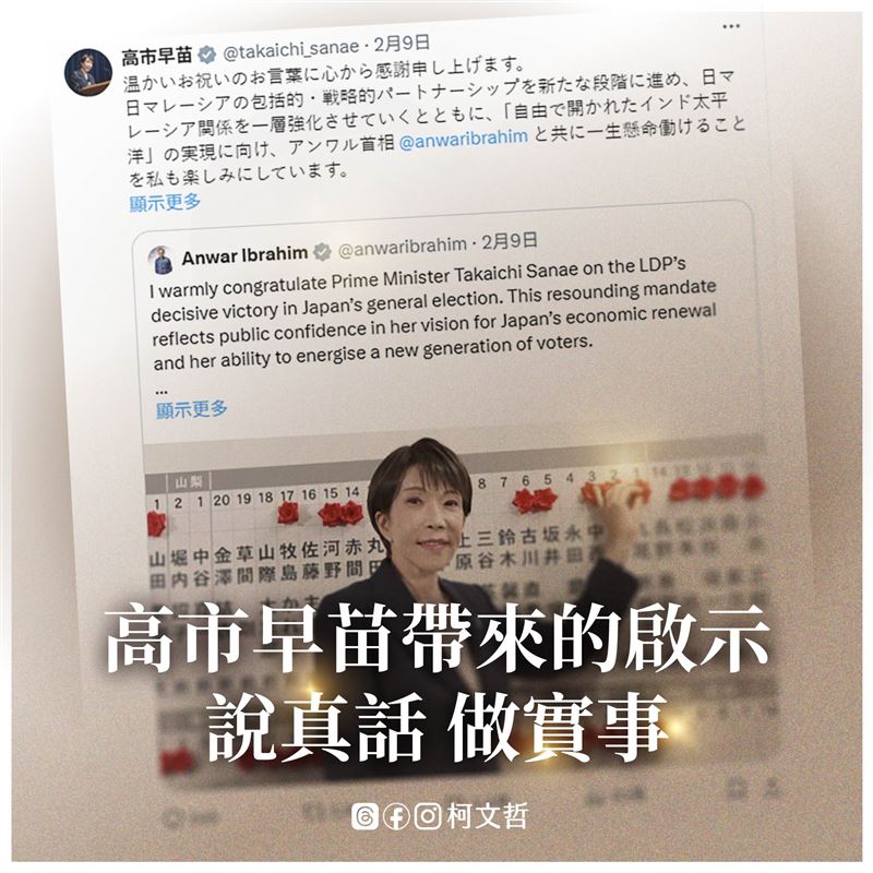 日本首相高市早苗率領自民黨在眾議院選舉中拿下316席,加上執政盟友日本維新會,席次達到352席,被譽為「史詩級勝利」!對此,民眾黨創黨主席柯文哲今(11)日有感而發表示「政治不該只有內耗,更要給人民希望」,並認為高市早苗帶來三個啟示,要敢於「說真話、做實事」。