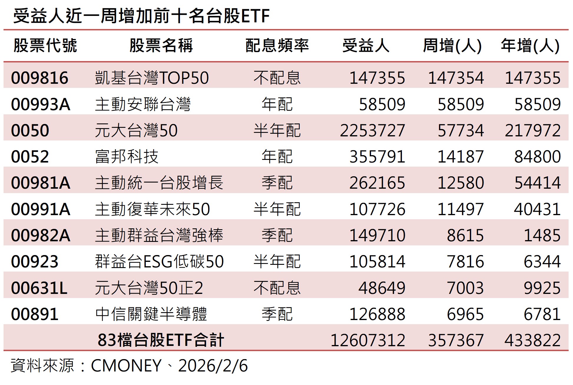 根據集保戶股權分散2月6日最新統計資料顯示,台股ETF總檔數來到83檔,受益人數上周增加35萬7,367人,總人數來到1,260萬7,312人連續3周創新高,統計今年來已增加43萬3,822人。