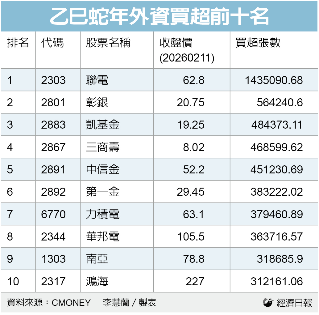 外資雖是大幅賣超台股,但統計外資蛇年買超前十名個股發現,買超聯電(2303)高達143萬5,091張,居外資買超個股第一名,股價封關日收在62.8元, 蛇年漲幅56.22%;彰銀(2801)為外資蛇年買超第二名,獲外資買超56萬4,241張。