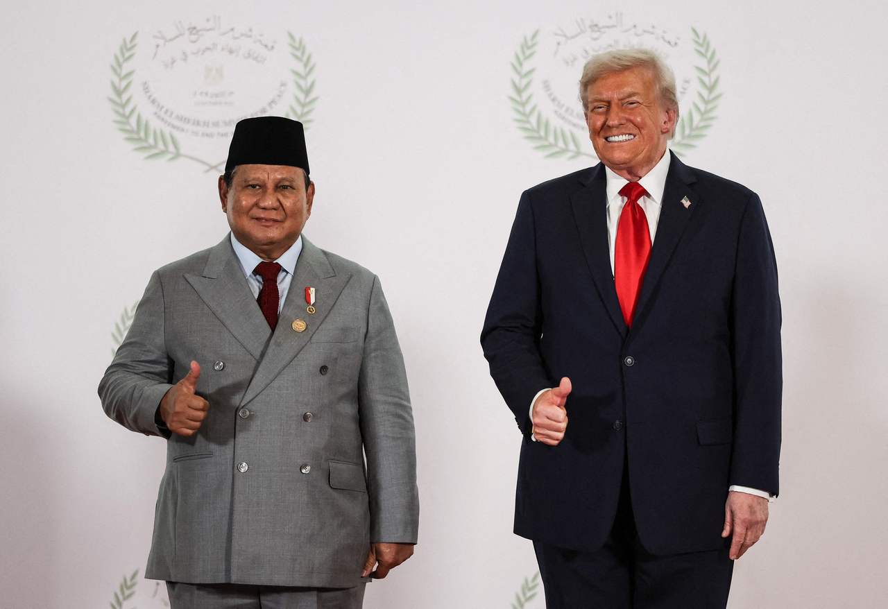印尼總統普拉伯沃(左)去年出席在埃及舉行的加薩走廊問題峰會上,與美國總統川普合影。路透