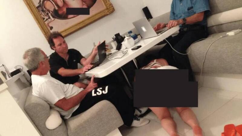 照片中這名身分不明的女子面朝牆壁趴在地上,臀部朝外,腳邊還有一雙橘色拖鞋。美國司法部在公開照片前,已將女子臀部及牆上裸嬰畫作敏感部位塗黑處理。