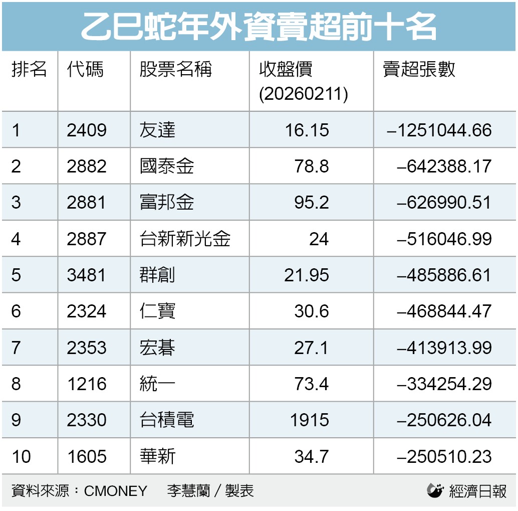 但統計蛇年三大法人買賣超個股發現,台積電呈現土洋對作,外資蛇年賣超台積電25萬626張,不過,投信同期間買超51,227張,自營商買超53,456張,三大法人合計賣超14萬5,943張。