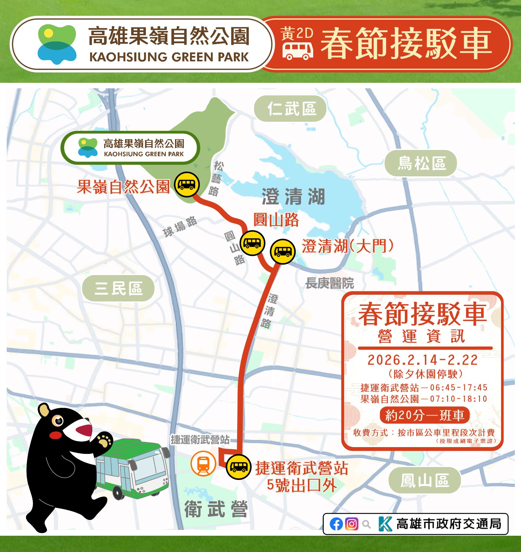 為因應春節連假期間高雄果嶺自然公園大量走春人潮,交通局啟動「春節限定接駁專案」,針對假期特性與區域交通負荷進行專案規劃與班次調整,自2月14日至2月22日(2月16日除夕停駛),將黃2D果嶺公園接駁公車改由捷運衛武營站5號出口發車,打造「出站即上車」的直達接駁動線。