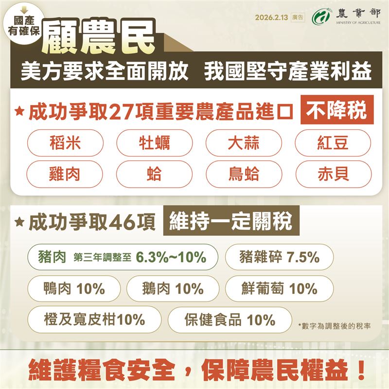 農業部表示,在對美農產品降稅方面,我國爭取稻米、雞肉、牡蠣、蛤、紅豆、大蒜等27項農產品不降稅,至於豬肉、豬雜碎、鴨肉、鵝肉、葡萄、橙及寬皮柑等46項重要產品則可維持一定關稅,其中豬肉更爭取到3年降稅調適期,成功確保糧食安全及維護農民權益。農業部說明,我國同意調降部分美國農產品關稅,主要是國內沒有或少量生產的品項,高度仰賴進口,對美國降稅後產業與消費者都將受益,例如小麥、牛肉、龍蝦、鱈魚、蘋果、櫻桃及堅果等。至於豬肉、液態乳、葡萄、柑橘、花生等產品,則是國內需求量大,國產具有優勢且市占率高,美國產品主要是與其他進口國競爭。