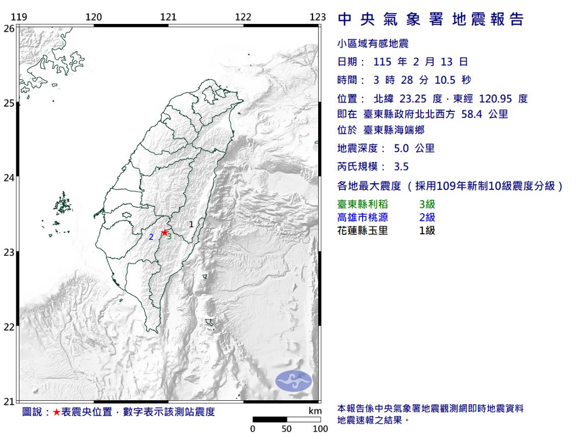 中央氣象署發布小區域有感地震報告,今天凌晨3時28分,在台東縣政府北北西方58.4公里,位於台東縣海端鄉,發生芮氏規模3.5地震,地震深度5公里。