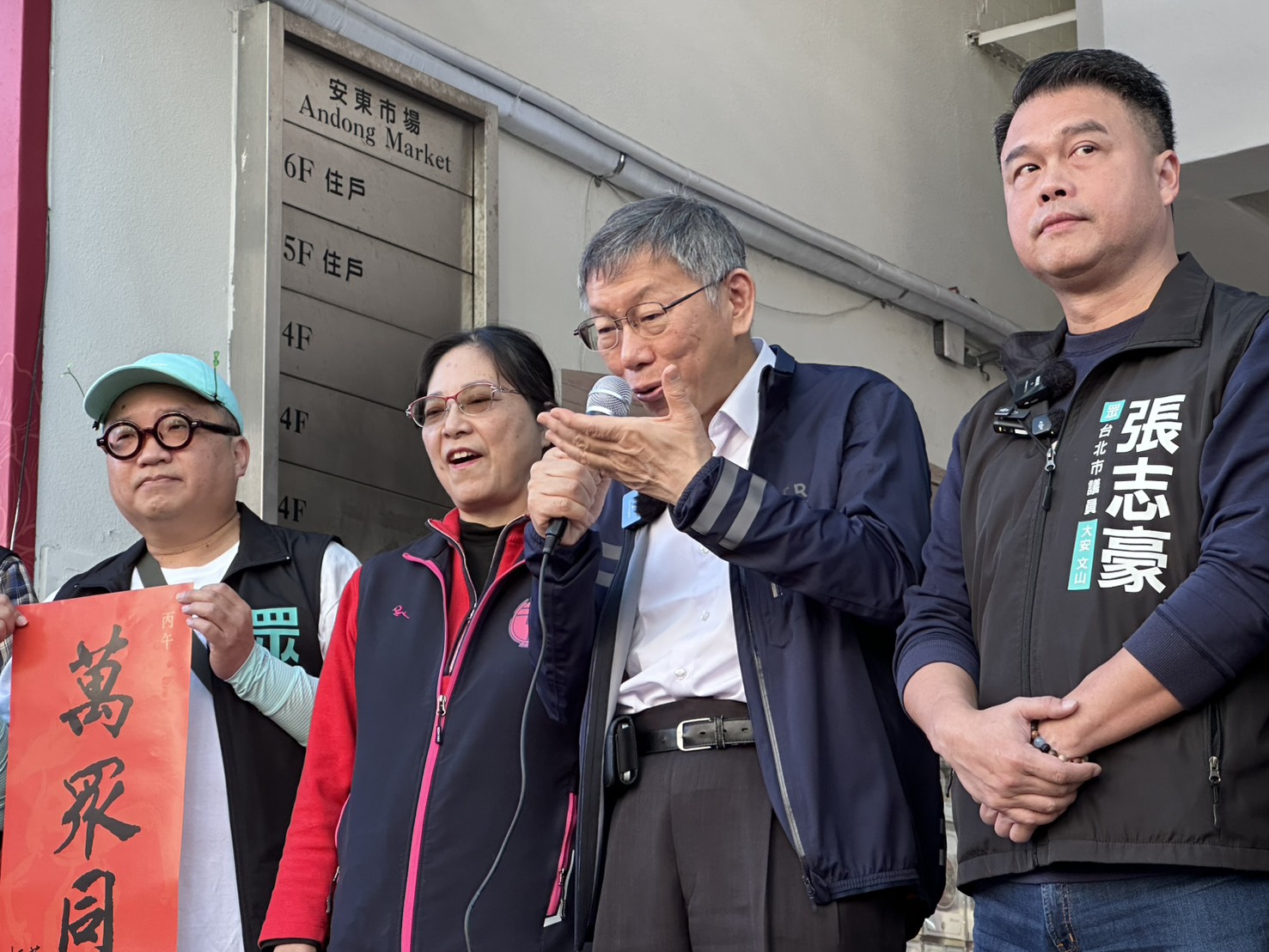 柯文哲今上午與台北市議員張志豪赴安東市場向市民朋友和攤商拜年、發送春聯。柯文哲受訪時表示,關於關稅問題,賴總統呼籲在野不要擋嘛,不過重點不是在野要不要審查,而是要有東西進來立法院讓在野黨審查。