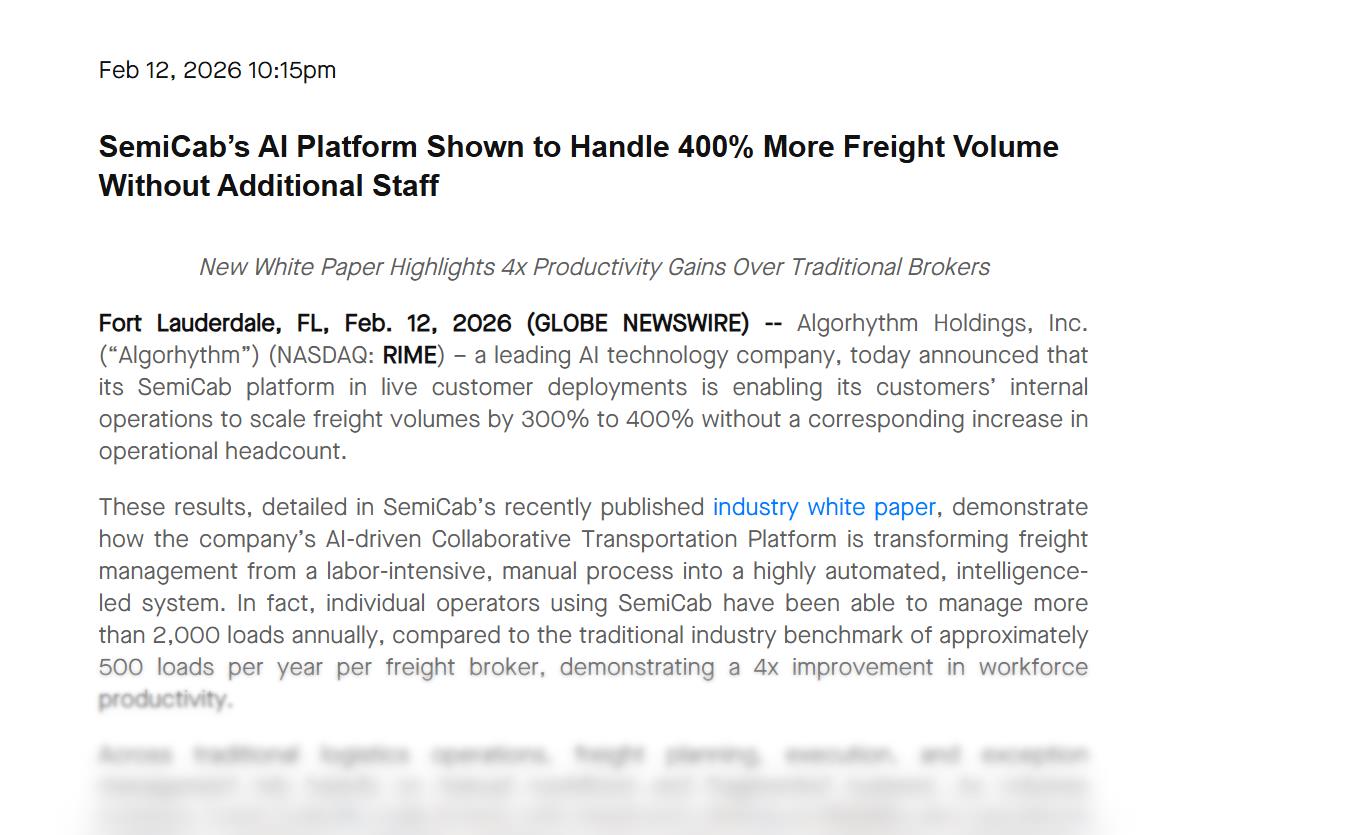 前身為「The Singing Machine Company」的 Algorhythm控股公司宣布,旗下的 SemiCab 平台正協助客戶在不增加營運人力的情況下,將貨運量提升 300% 至 400%。