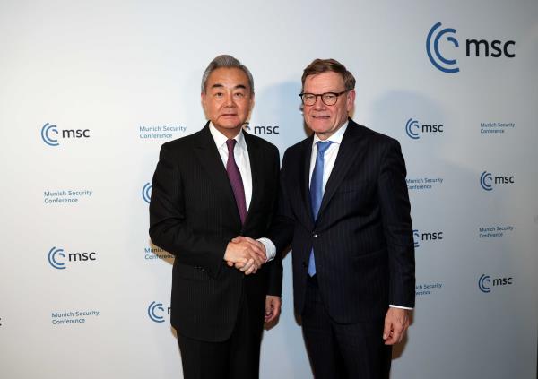 中德法三國外長藉出席慕尼黑安全會議期間舉行首度中德法外長三方會晤,並舉行中德、中法雙邊會見。圖為大陸外長王毅與德國外長瓦德富雙邊會見時握手致意。 大陸外交部網站