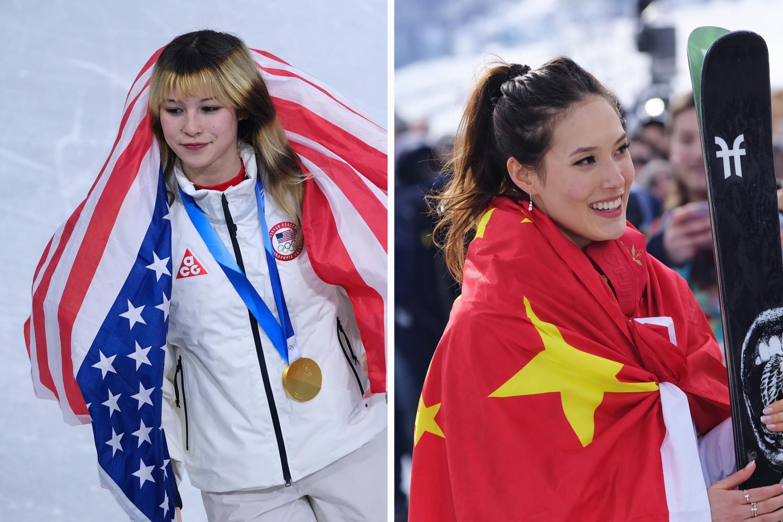 為中國隊出賽的谷愛凌(右)與為美國隊出賽的劉美賢(左),同為在美國出生成長的混血華裔二代,卻在中美兩國的網路輿論中獲得截然不同的評價。美聯社