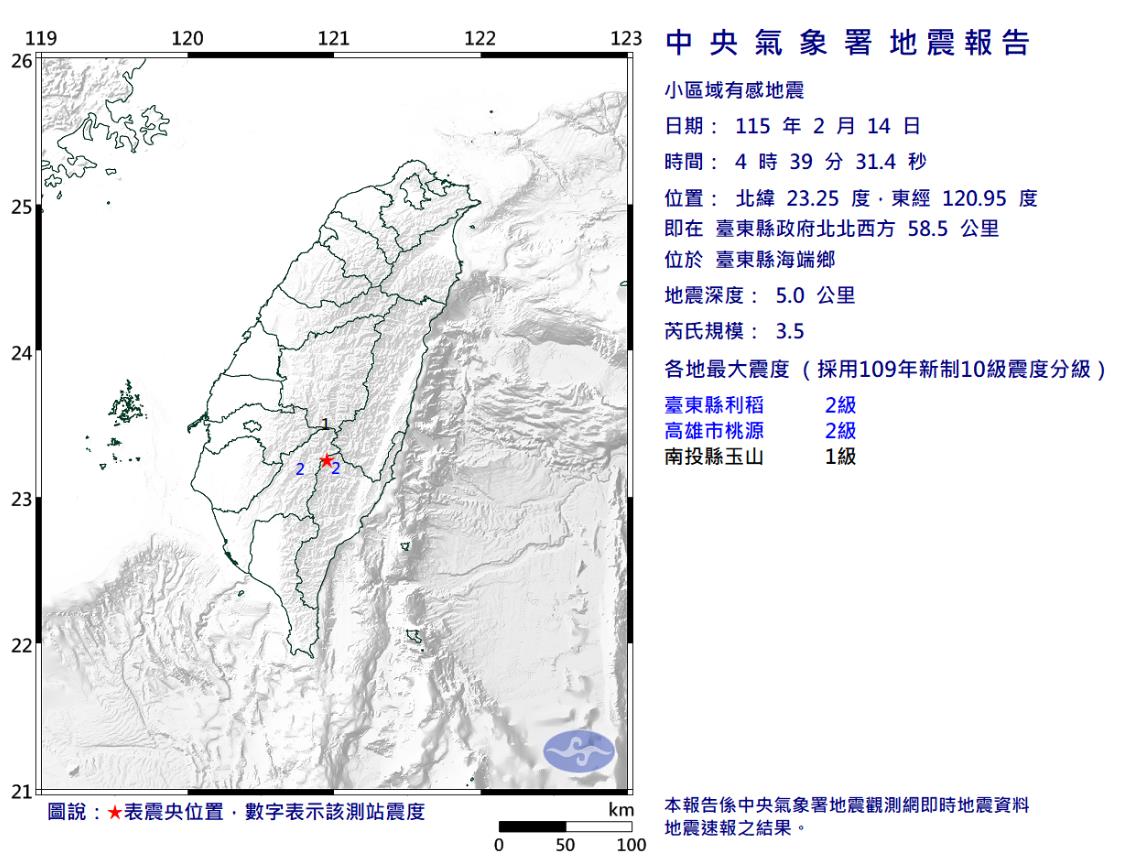 中央氣象署發布小區域有感地震報告,今天凌晨4時39分,在台東縣政府北北西方58.4公里,位於台東縣海端鄉,發生芮氏規模3.5地震,地震深度5公里。