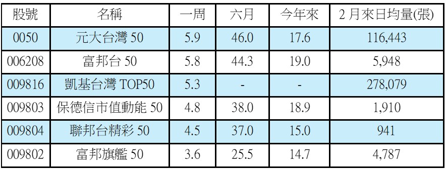 值得注意的是,新兵凱基台灣TOP50(009816)雖成立時間尚短,近一周漲幅仍有5.3%,更在2月以來日均量衝上27.8萬張,居同類型之冠,市場關注度與短線交易熱度快速升溫。相較之下,0050日均量約11.6萬張,仍為資金布局的核心標的。