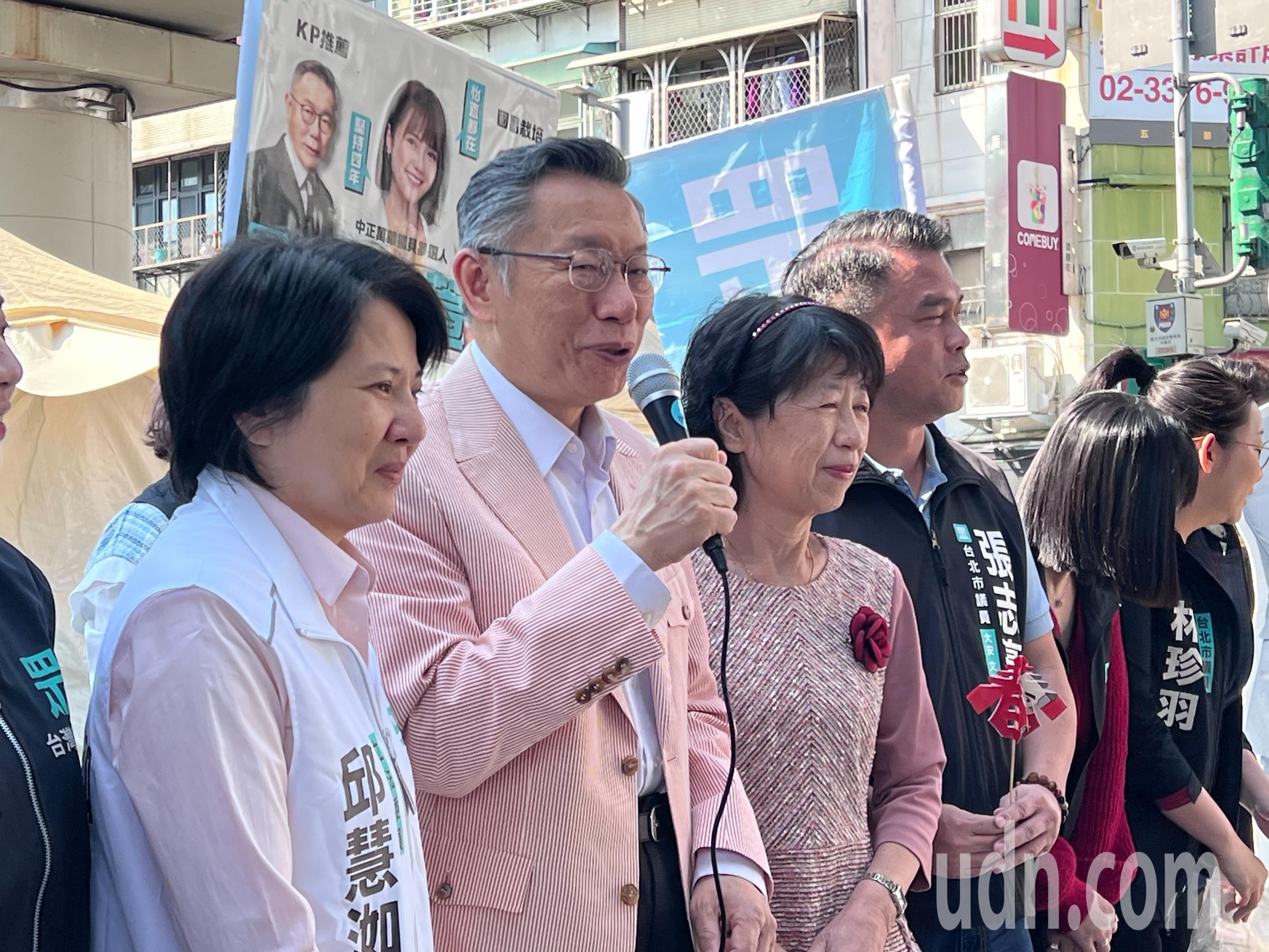 民眾黨前主席柯文哲偕妻子陳佩琪上午與秘書長周榆修、北市黨部主委邱慧洳、北市議員黃瀞瑩、張志豪、陳宥丞、林珍羽、中正萬華區議員參選人吳怡萱等人,在捷運圓山站外發送春聯、紅包、發財金。