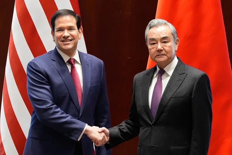 大陸外交部長王毅13日在出席慕尼黑安全會議期間會見美國國務卿魯比歐。兩人會前握手並合影。 美聯社