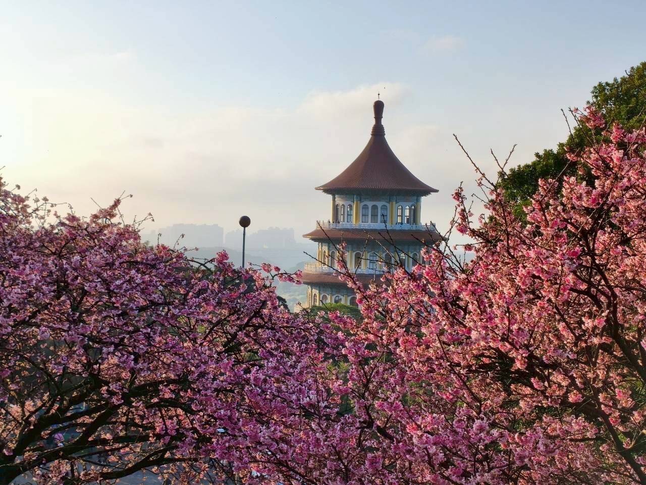 淡水天元宮三色櫻在暖陽映照下已盛開,粉白花海點綴天元宮後山,美不勝收。圖/新北市景觀處提供