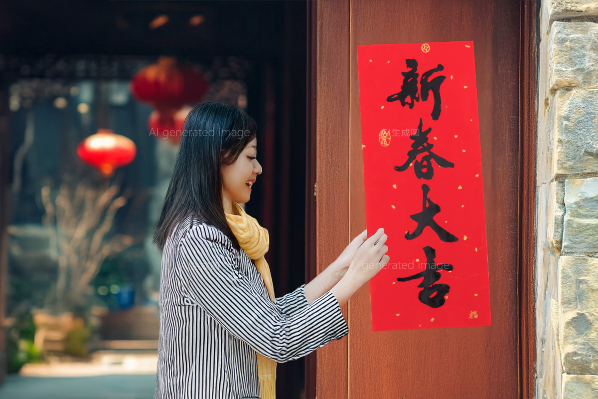 必須先貼右邊的「上聯」,再貼左邊的「下聯」,最後才是貼正上方的「橫批」,且上方橫批應貼在門框正中央。