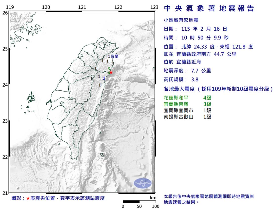 中央氣象署發布小區域有感地震報告,今天上午10時50分,在宜蘭縣政府南方44.7公里,位於宜蘭縣近海,發生芮氏規模3.8地震,地震深度7.7公里。