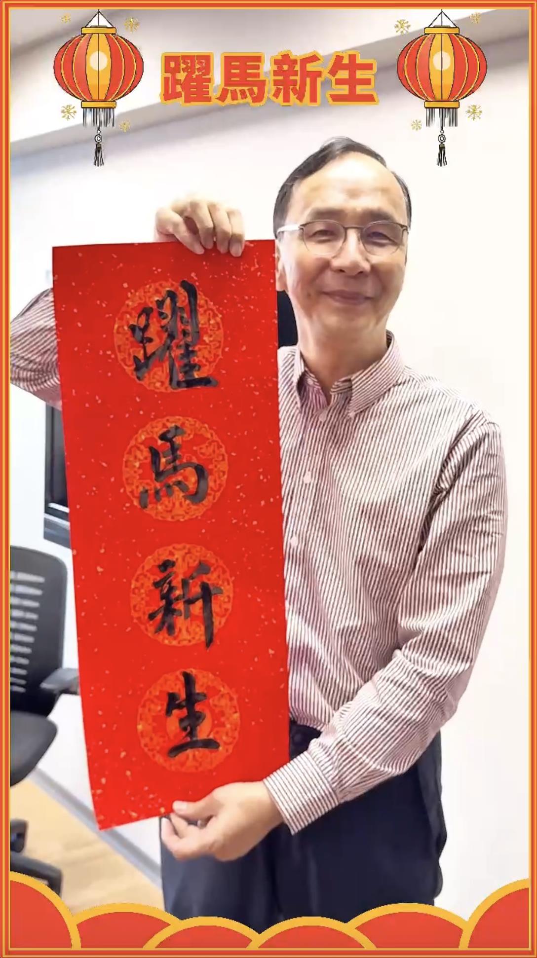 今為農曆春節的除夕,今年也適逢馬年,國民黨前主席朱立倫揮毫祝福台灣民眾「躍馬新生」。朱立倫一寫完,即把作品拿給其辦公室同仁欣賞,迫不及待想得到讚美。