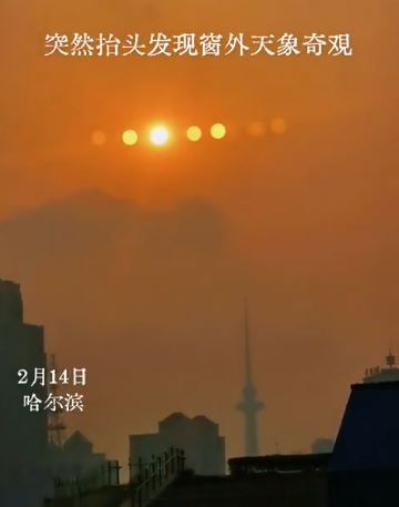 【哈爾濱七日同天 多日爭輝震驚目擊者】2月14日下午,黑龍江哈爾濱紅博中央公園上空,出現了足以載入史冊的震撼畫面。目擊民眾拍下天空中竟同時排列著7個太陽,其中第三個光芒最為耀眼,其餘分佈左右,虛實交錯。